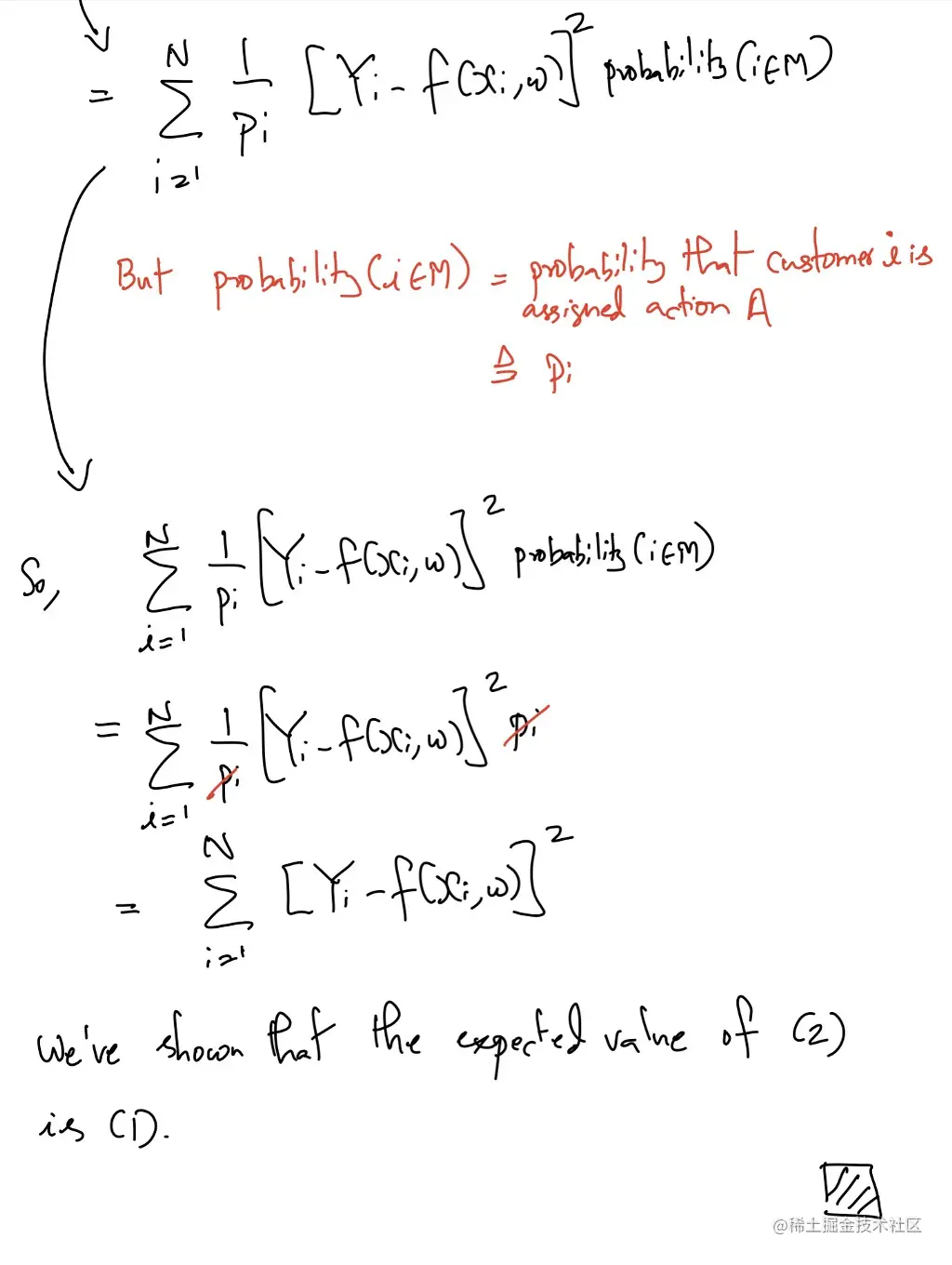 如果这个概率倒数业务让你想起了[第三部分](http://For the mathematically curious, here’s my attempt at a clearer version of the proof on the Wikipedia page that shows how the Horvitz-Thompson Estimator unbiasedly estimates the outcome of any policy.)中的霍维茨-汤普森估计器的工作原理,你的直觉是正确的!事实上,我们可以用一个类似的论证来证明IWR的工作。如果你感到好奇,帖子底部有一个代数证明。