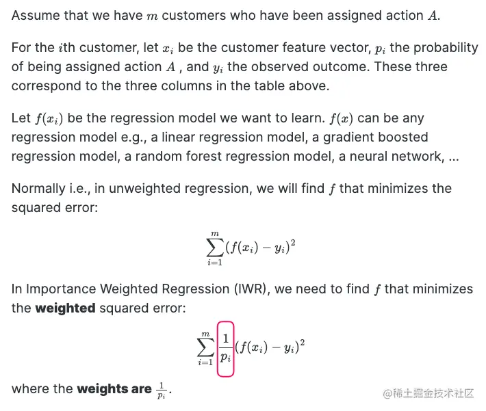 一个相对简单的方法叫做 重要性加权回归 (IWR) 在比赛中表现出色,下面我将介绍它。IWR直接利用了我们关于如何建立回归模型的知识,直观易懂,并且可以使用你选择的任何监督学习回归方法轻松实现(如果你对基础理论感兴趣,请参见《使用回归奥拉的实用情境匪徒》)。