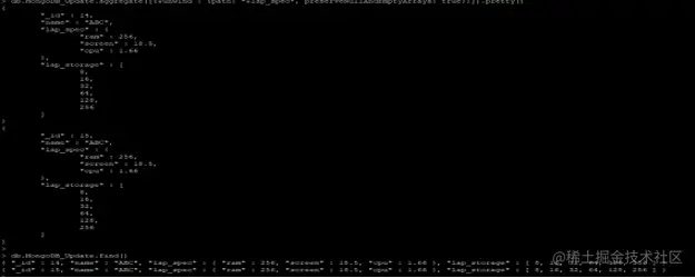 db.MongoDB_Update.aggregate ([{$unwind: {path: "$lap_spec", preserveNullAndEmptyArrays: true}}]).pretty () db.MongoDB_Update.find ()