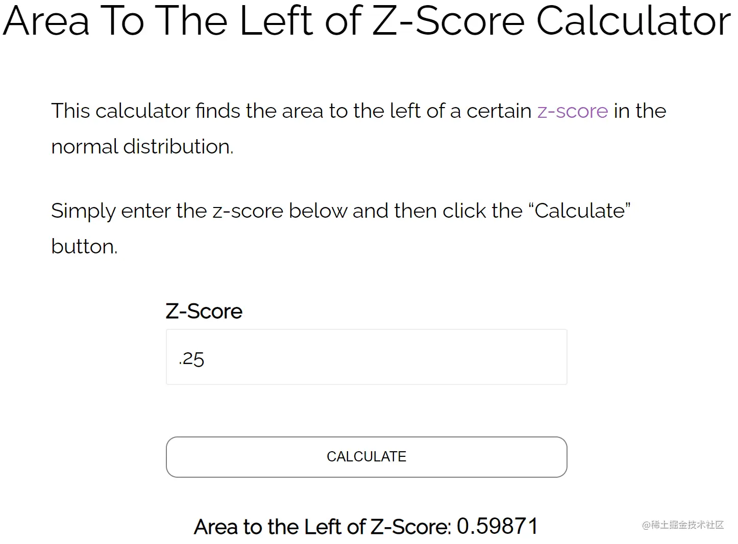 我们也可以使用Z-分数左边的面积计算器来发现z=0.25左边的面积是0.5987。