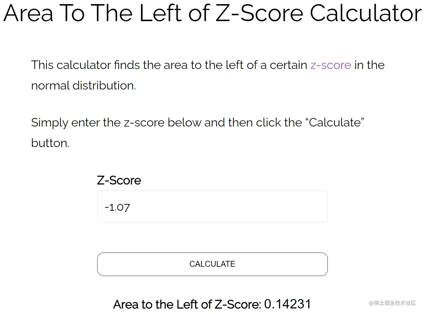 我们也可以使用Z-分数左边的面积计算器来计算z=-1.07左边的面积是0.1423。
