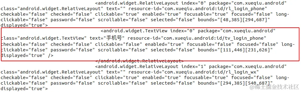 uiautomatorviewer 抓取快照展示出来的元素属性是经过解析的,我们要查看 XML DOM 的真实结构可以打印 pagesource ,得到的内容如下,红色框起来的部分为上图的定位的 XML DOM 中的一个节点: