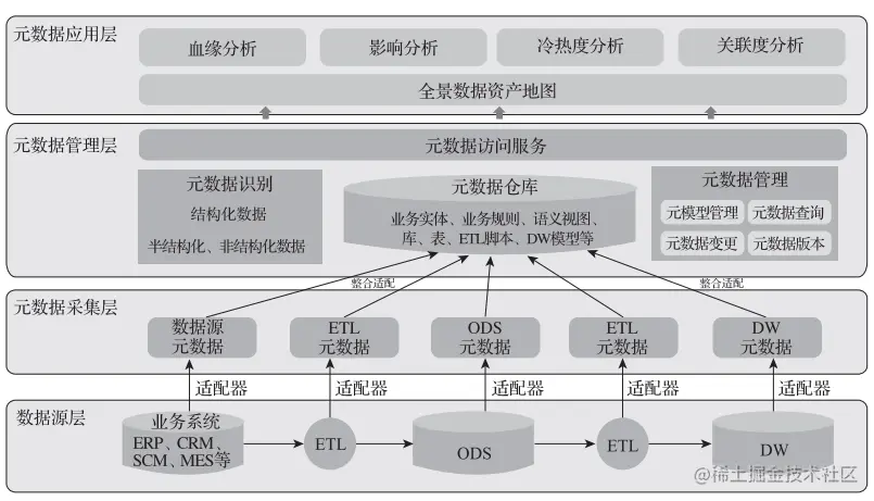 元数据管理层提供了对元数据的管理、维护、查询功能,包括元数据查询、元数据管理、元数据版本管理、元数据变更管理、元数据适配器管理等。