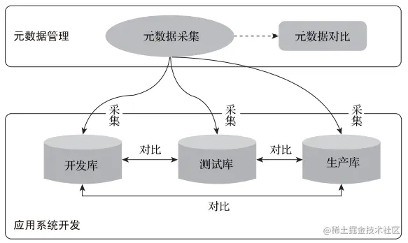 3)通过元数据管理工具自动化采集开发、测试、生产三个环境的库结构、表结构、字段结构、视图与存储过程结构等元数据。