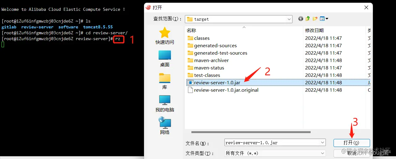 安装该命令后,所以我们直接在服务器中,执行rz上传命令,只需要输入rz,然后回车,即会跳转打开本地桌面文件夹,然后选择我们打包好的xxx.jar。