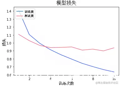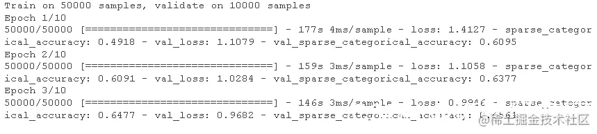 这是 compiling 模型和 fitting 训练数据。我们将使用 10 epochs 来训练模型。一个时期是对所提供的整个数据的迭代。 是在每个 epoch 结束时validation_data 评估和任何模型指标的 数据。loss模型不会根据这些数据进行训练。由于指标 = ['sparse_categorical_accuracy'] 模型将基于 accuracy.