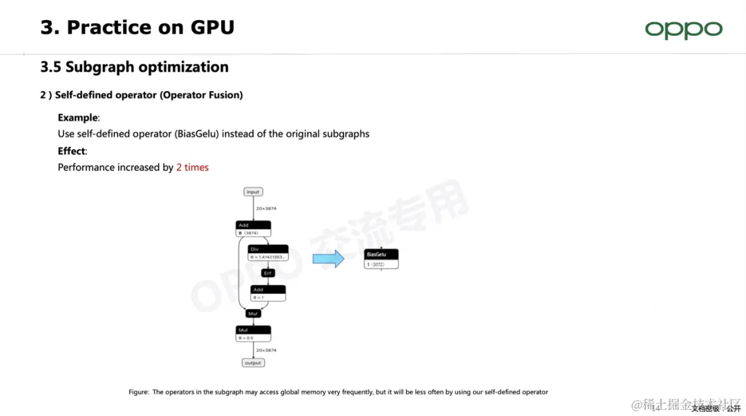 例如,上面的例子中我们将左边这6个算子组成的pattern,自定义为BiasGelu融合算子,这个融合减少了算子调度引起的global memory拷贝,带来了2倍的性能提升。
