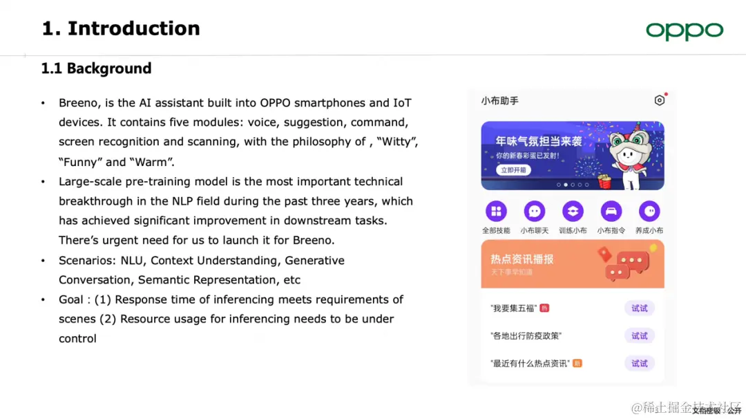 在上周结束的Nvidia GTC 2022会议上,OPPO数智工程事业部机器学习团队分享了主题为《Evolution Path of GPU Inference Accelerating on Breeno Bot/NLP Scenario》的报告,主要讲述在GPU推理加速在小布助手NLP场景的演进路线,包含以下4个模块内容: