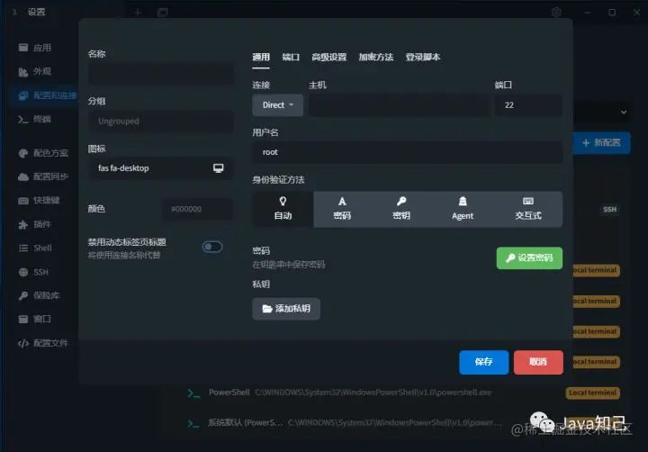 对于新建SSH连接,相信是很多人必定要用到的。在【设置】--》【配置与连接】--》【新配置】--》【SSH连接】,然后填写服务机主机信息即可正常连接使用了。\
