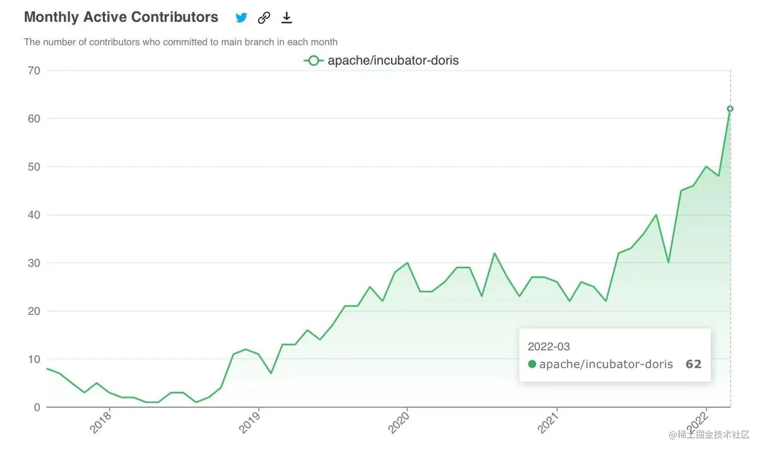 与此同时,Apache Doris 的贡献者数量已超过 300 人,每月活跃的贡献者数量超过了 60 人,近几周平均每周提交的 Commits 数量也超过 80,社区聚集的开发者规模及活跃度已经有了极大的提升。我们十分期待有更多的小伙伴参与社区贡献中来,与我们一道把 Apache Doris 打造成全球顶级的分析型数据库,也期待所有小伙伴可以与我们一起收获宝贵的成长。如果你想参与社区,欢迎通过开发者邮箱 dev@doris.apache.org 与我们取得联系。