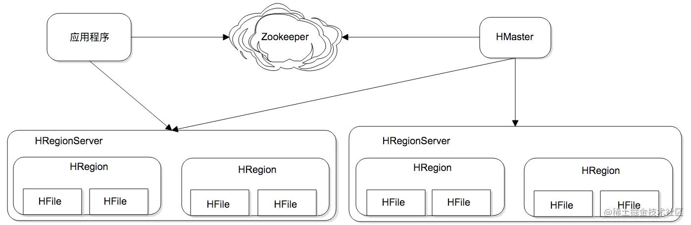 应用程序通过zk获得主HMaster地址,输入K值获得这个K所在的HRegionServer地址,然后请求HRegionServer上的HRegion,获得所需数据。