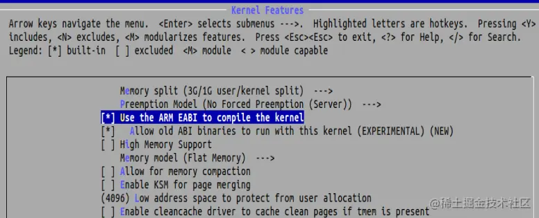 Use the ARM EABI to compile the kernel和Allow old ABI binaries to run with this kernel (EXPERIMENTAL)。