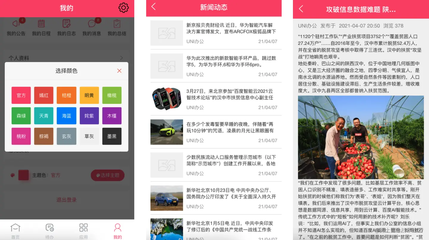 UNI办公系统主要为国内企业提供办公自动化信息服务,功能如:工作流、工作审批(报修申请、报销申请、领用申请、申购申请、请假申请、出差申请、加班申请、用工申请、接待申请、用车申请);个人中心(公告管理、消息管理、工作日志、我的日程、工作总结);知识管理(新闻动态、管理制度、下载中心等);日常管理(资产管理、车辆管理、档案管理、考勤管理、巡更巡检、合同管理、后勤采购、就餐统计、通讯录(支持企业微信同步));人事管理(员工信息、奖惩管理、社保管理等)、考勤管理(班次管理、排班管理、我的排班、签到签退);巡更巡检(地点管理、巡更班次、巡更计划、我的排班、巡更记录);意见反馈、站点帮助、在线客服、一键换肤等功能模块。