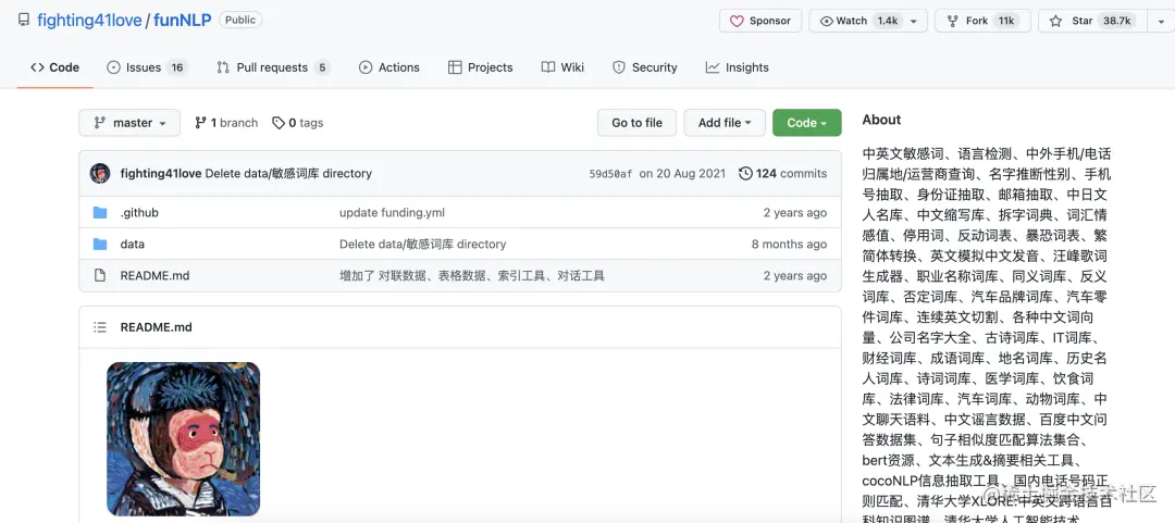 这个开源项目整理了很多自然语言处理的工具库,涉及内容包括但不限于:中英文敏感词、语言检测、名字推断性别、手机号抽取、身份证抽取、邮箱抽取、中日文人名库、中文缩写库、拆字词典、词汇情感值、停用词、反动词表等等。