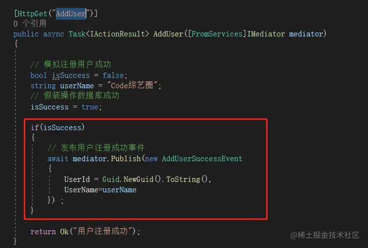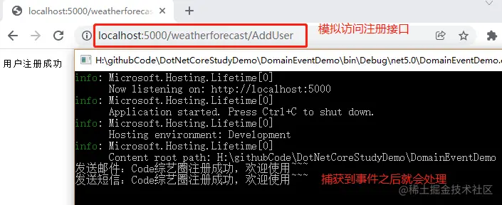 模拟用户注册成功发布领域事件,这里在默认的控制器里添加一个接口进行测试,代码如下: