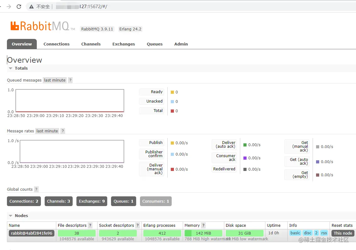 docker run -di --name myrabbit -e RABBITMQ_DEFAULT_USER=admin -e RABBITMQ_DEFAULT_PASS=admin -p 15672:15672 -p 5672:5672 -p 25672:25672 -p 61613:61613 -p 1883:1883 rabbitmq:management这个命令指定了默认用户为admin,默认密码也是admin,如果能正常登陆RabbitMQ系统,代表安装成功了,如下: