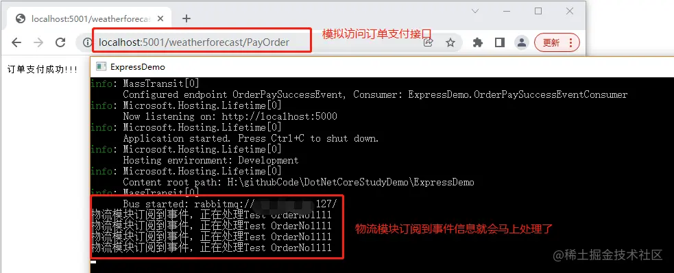 在订单模块访问发布接口,物流模块收到事件消息之后就会马上处理如下: