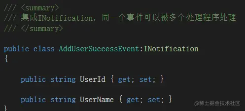 发布的事件信息其实就是一个对象信息,只是该类按照MediatR约定继承对应的接口即可,如下: