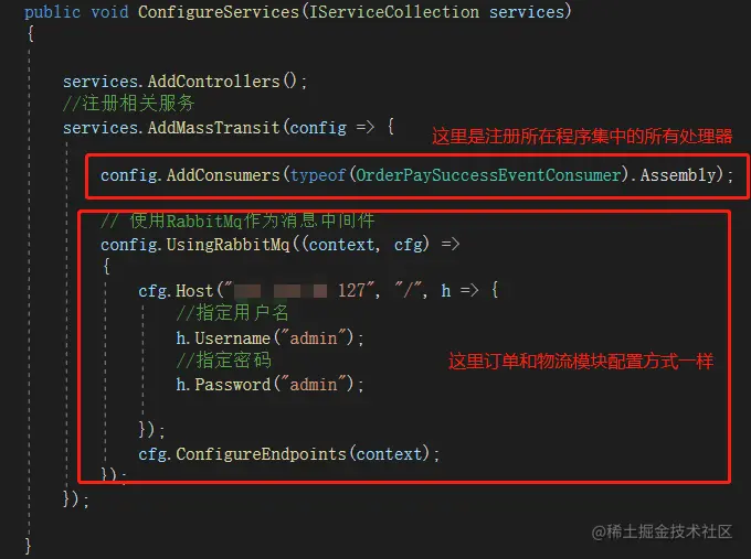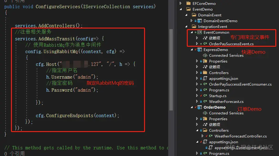 准备两个API项目,一个模拟订单发布事件,一个模拟物流订阅事件,首先都需要引入相关的Nuget包:MassTransit、MassTransit.RabbitMQ,并注册相关服务,如下: