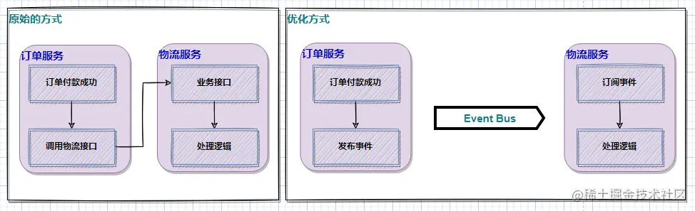 原始的这种方式,像我有点年长的小伙伴应该之前都用过,当然现在有很多传统企业项目也是这种方式。这种方式主要是通过接口的形式进行模块或系统之间的对接,这样对接成本稍微偏高,因为订单服务还需要开发调用物流服务接口的逻辑,还要各种联调,考虑接口超时、失败等各种情况;另外如果还有其他业务模块的系统需要对接怎么办,如果接口规范不一样,还得重复再开发一套调用逻辑,这样后面订单服务这个模块就变得很臃肿,而且模块间的耦合性比较高。