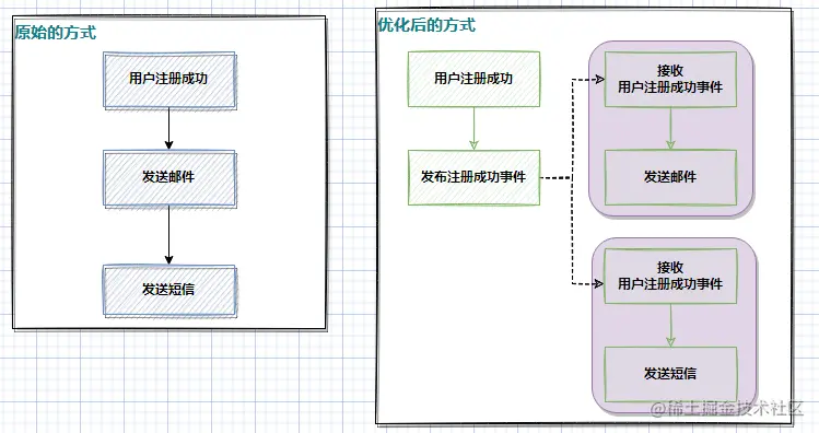 对于优化后的这种方式,只需要在注册成功之后发布一个事件出来就行了,至于后面要发送什么样的消息不用管,只要捕获到事件消息,只需新增额外扩展的处理器类即可,就算是取消,只需不捕获对应的事件就行,无需改动原有用户注册代码的逻辑。这种方式的事件就可以理解为领域事件。