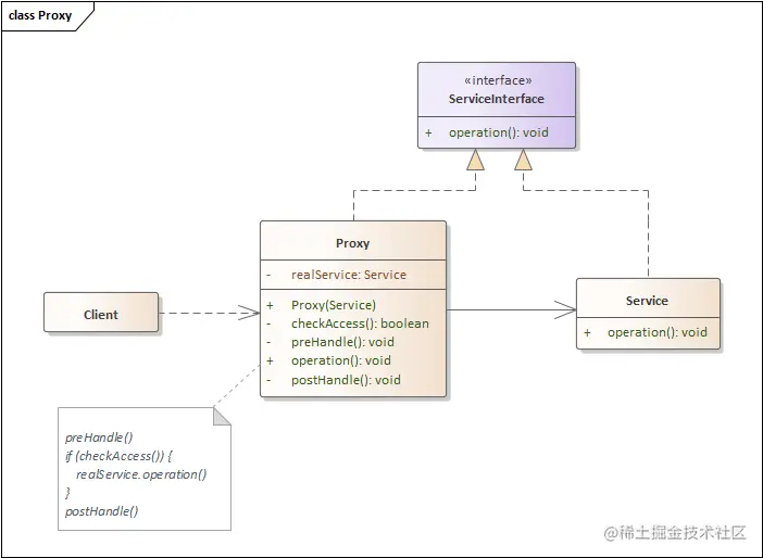 ServiceInterface:服务接口声明了抽象的业务逻辑Service:服务类提供了具体实用的业务逻辑Proxy:代理类包含一个指向服务对象的引用成员变量,代理完成其他额外任务后会将请求传递给服务对象Client:能通过统一接口与服务对象/代理对象进行交互