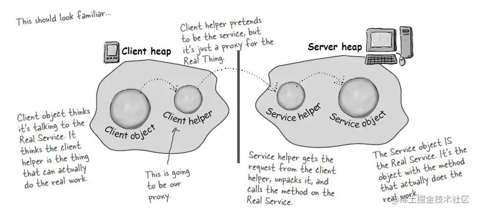 - 从面向过程的角度:为了实现本地到远程的通信,我们需要实现网络通信,不过为了良好的代码设计和可维护性,我们将网络通信部分隐藏起来,只暴露给本地服务一个接口,通过该接口即可访问远程服务提供的功能,而不必过多关心通信部分的细节。