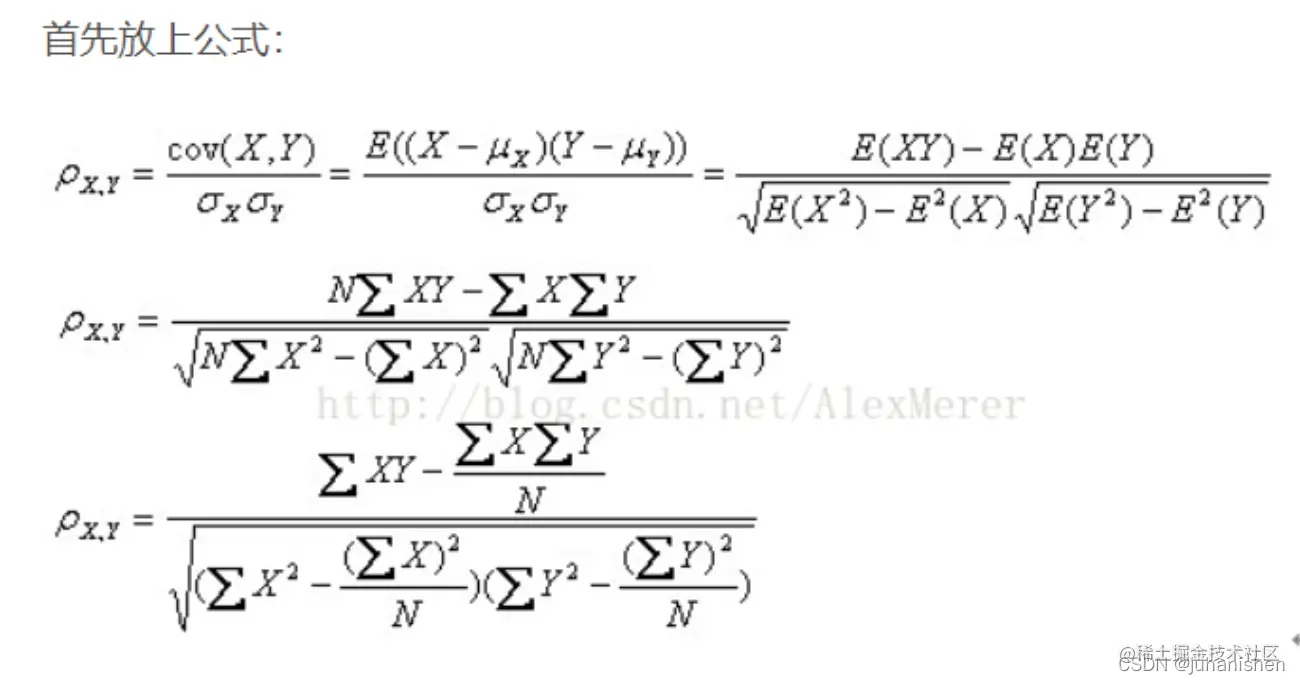 公式定义为: 两个连续变量(X,Y)的pearson相关性系数(Px,y)等于它们之间的协方差cov(X,Y)除以它们各自标准差的乘积(σX,σY)。系数的取值总是在-1.0到1.0之间,接近0的变量被成为无相关性,接近1或者-1被称为具有强相关性。