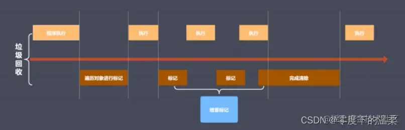 标记增量其实是通过对标记操作进行标记的方法,让时间安排变得合理。这句话可能有些绕,简单说就是在垃圾回收时,让标记系统在标记时分出不同的时间段,分别进行标记和执行,让二者的操作间隔开,从而优化时间安排,这会让页面在体感上更为顺畅。