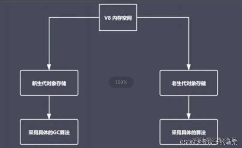 V8 采用分代回收的垃圾回收策略,将内存分为新生代和旧生代两种,并对不同的对象采用不同的对应算法。