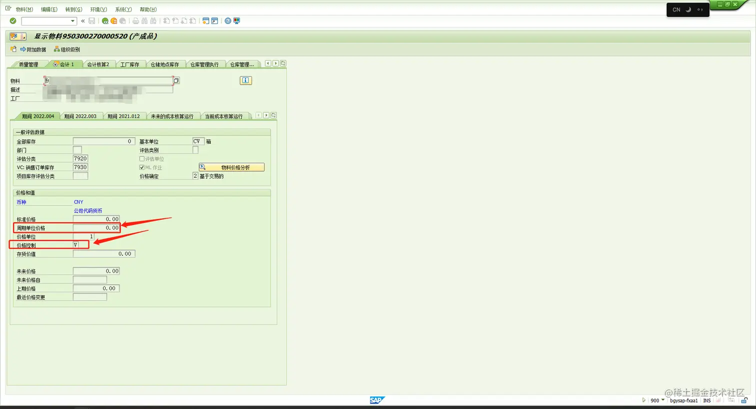 首先看看这个物料是什么价格控制类型: