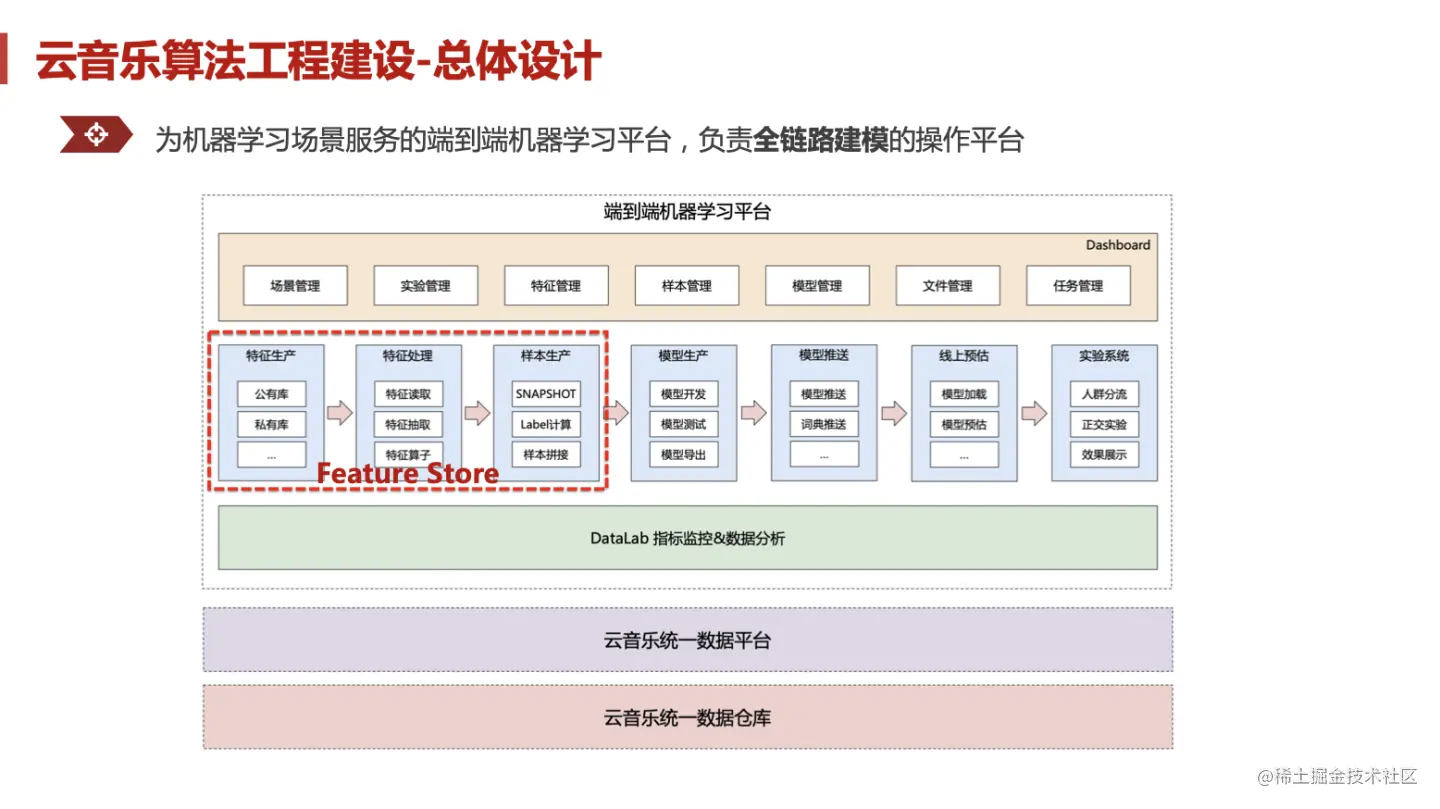 对于网易云音乐来说,随着业务的发展,云音乐DAU提升至几千W级别、几十算法场景、几百算法模型、算法团队几十人情况下,如果没有全流程工程化系统、平台支撑,就会出现特征失控、复杂的DNN上不去、周期拉的很长、算法效果受制约的情况。基于这种实时化程度低、建模效率低、模型能力受限的背景,为了提升云音乐算法在支撑商业化、内容分发业务时的建模效率,助力算法效果提升,云音乐设计出了如下图所示包含特征生产、特征处理、样本生产、模型生产、模型上线等的一站式全链路端到端的学习平台。