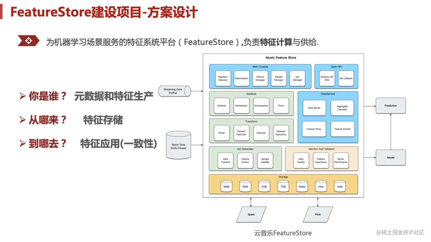 随着云音乐在多业务覆盖中发现,大部分痛点都集中在特征上,其中复用/发现难、一致性难、开发效率低的问题尤为关键。面对如何实现特征处理标准化,提高特征样本开发效率并带来算法效果的提升是云音乐的目标。所以基于云音乐的业务,自建了云音乐的FeatureStore,整体框架可以分成从特征存储到转换到特征上线,由此提供了为机器学习场景服务的特征系统平台(FeatureStore)来负责特征计算与供给。