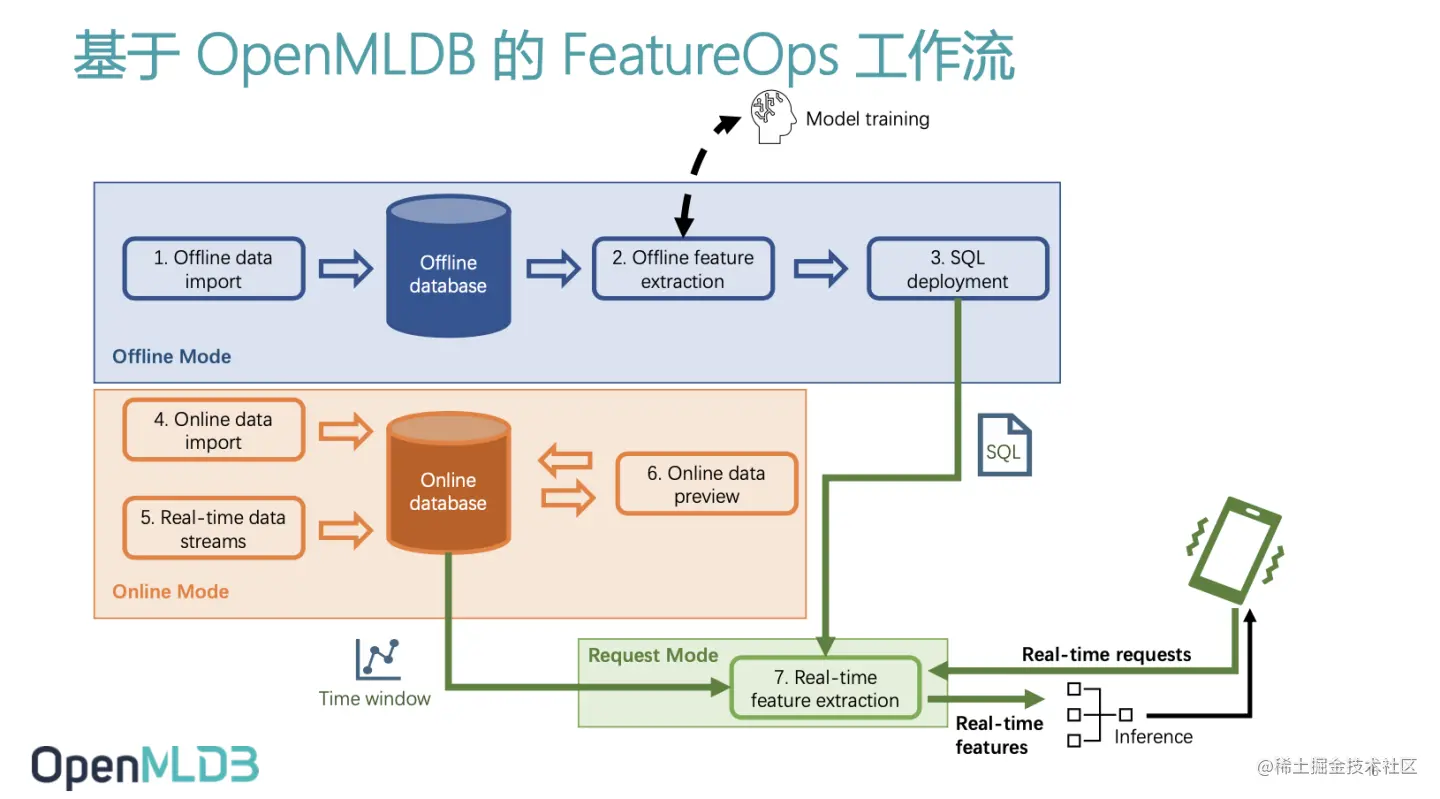 FeatureOps工程化面临的最大挑战是线上线下的一致性校验问题。在实际过程中,工具能力的不一致性和需求沟通的认知差都会导致线上线下的不一致,为了校验这种不一致带来了高昂的工程化落地成本。面临这种问题,市场上1%的头部企业会可能会选择耗费上千小时来自研构建平台;非头部企业则可能会选择采购昂贵的SaaS工具和服务。而开源项目OpenMLDB的出现则提供了更低成本更高效的企业级解决方案。开发者只需要三步即可做到开发即上线的功能,即线下SQL特征脚本开发、一键部署上线、介入实时请求数据流。