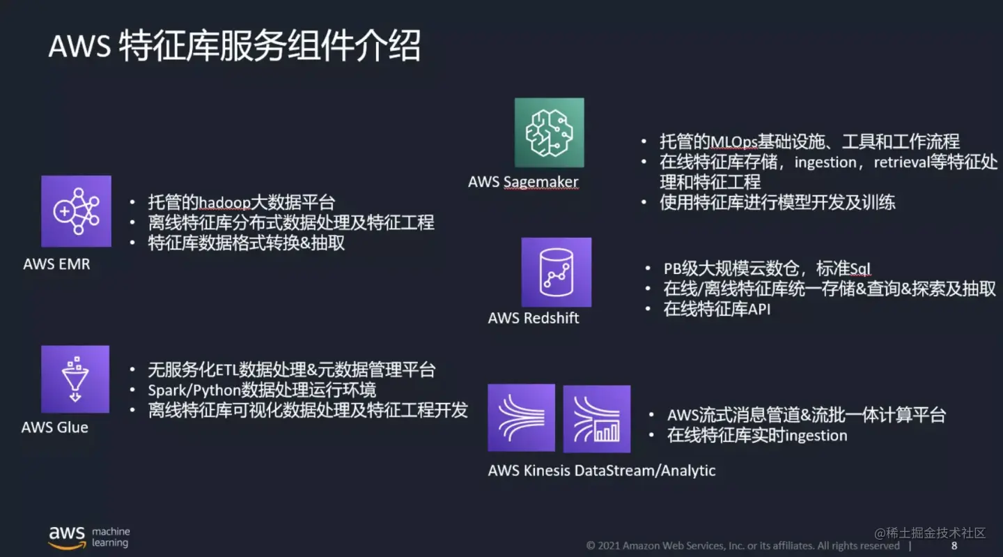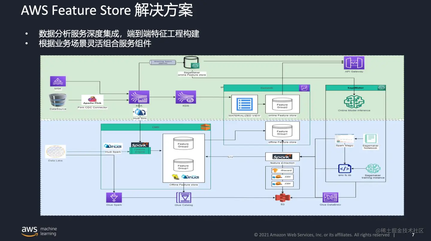 所以面对这些问题,AWS有了自己的FeatureStore解决方案,整体思路可以总结为与AWS的大数据&数据分析服务深度集成,形成端到端的特征工程构件,同时根据业务场景的针对性,灵活组合服务组件。
