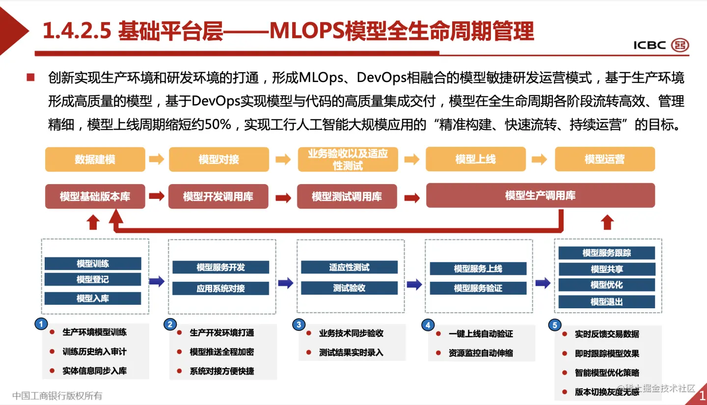 其中,为了满足大规模的模型训练同时还能保证高质量的管理,工行创新实现了生产环境和研发环境的打通,形成MLOps、DevOps相融合的模型敏捷研发运营模式,基于生产环境形成高质量的模型,基于DevOps实现模型与代码的高质量集成交付,模型在全生命周期各阶段流转高效、管理精细,模型上线周期缩短约50%,实现了工行人工智能大规模应用的“精准构建、快速流转、持续运营”的目标,下图所示为人工智能平台中基础平台层,MLOPS模型的全生命周期管理流程。