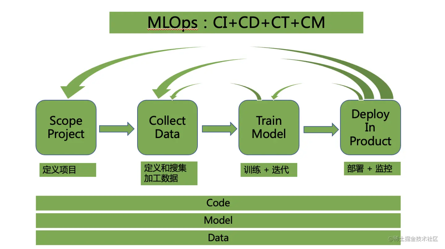 而落地慢的原因是在实际的生产环境中,与机器学习相关的代码只占很小一部分,AI系统是代码+数据+模型的整合,而数据又是其中最重要却又很难保证正确的部分。所以为了解决这一问题,在借鉴DevOps的经验后发展出了MLOps,如下图所示MLOps=CI+CD+CT+CM,即机器学习全过程从项目项目到定义和搜集加工数据到训练+迭代再到部署+监控的自动化循环与迭代,它包括了模型、代码与数据。
