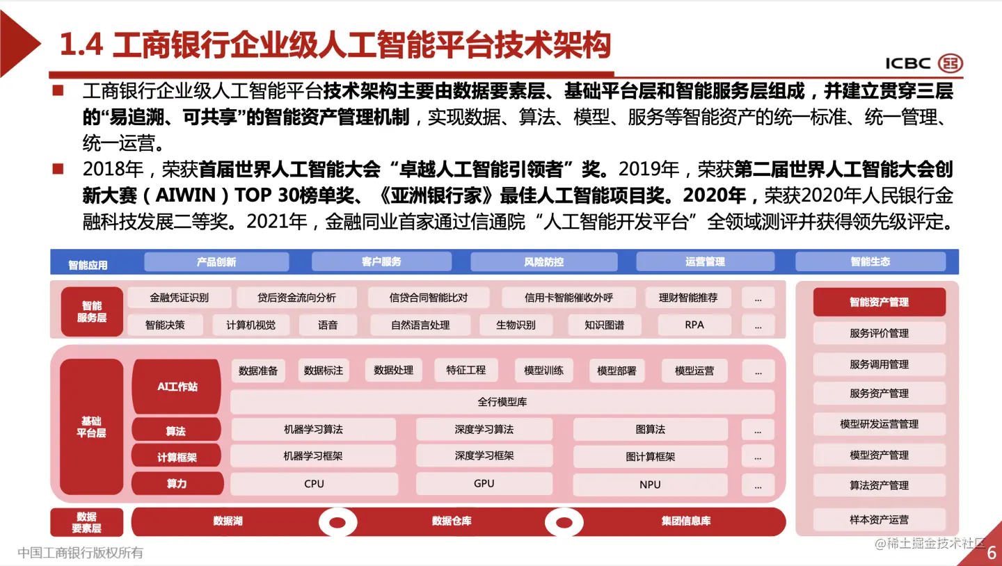 当前,中国工商银行的人工智能生态体系建设项目已经拥有了广泛的应用实践,实现智慧服务、智慧产品、智慧风控、智慧运营、 智慧生态等超过1500个业务应用落地,人工智能技术在工商银行已经进入规模化业务应用新阶段。