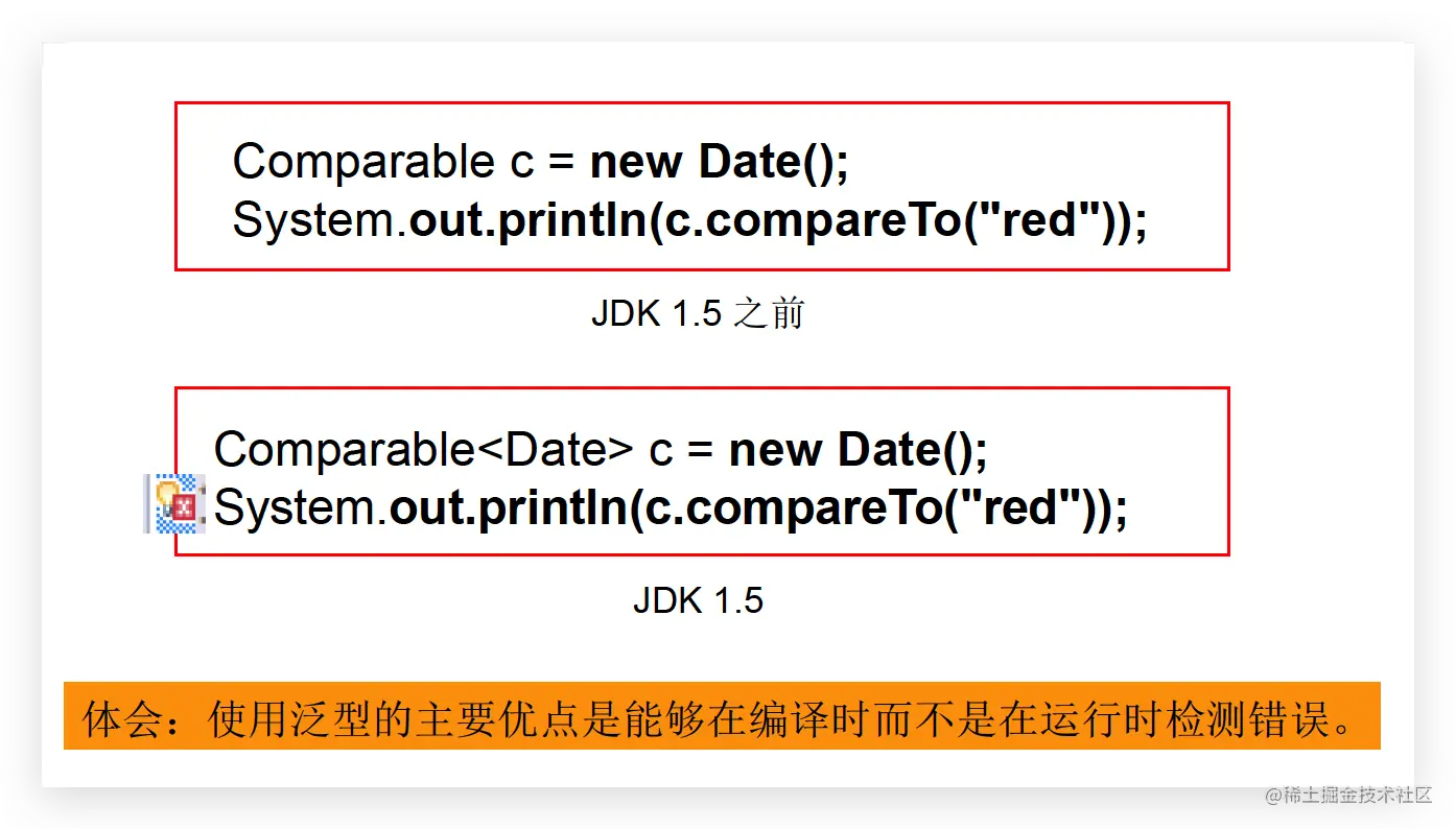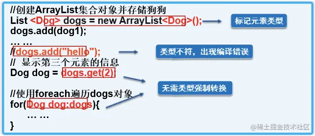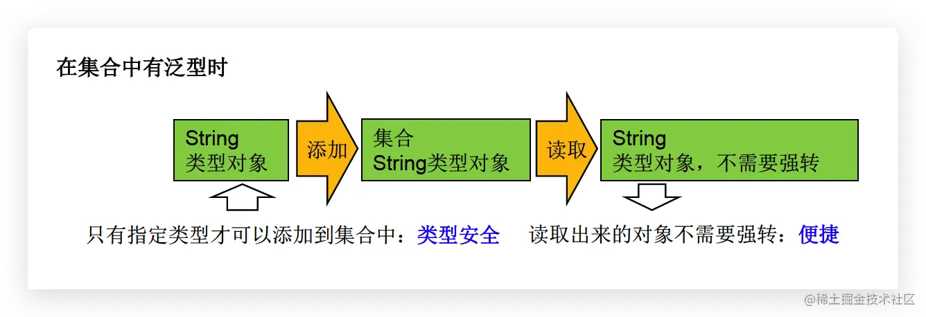 - 从JDK1.5以后,Java引入了“参数化类型(Parameterized type)”的概念,允许我们在创建集合时指定集合元素的类型,正如:List,这表明该List只能保存字符串类型的对象。