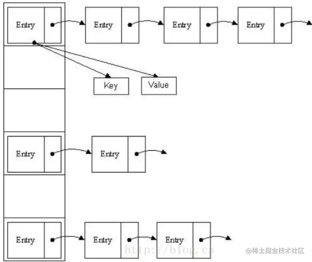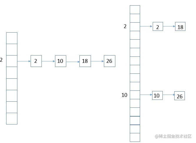 - 如果此位置上有其他元素b(或以链表形式存在的多个元素),则比较元素a于元素b的hash值:
