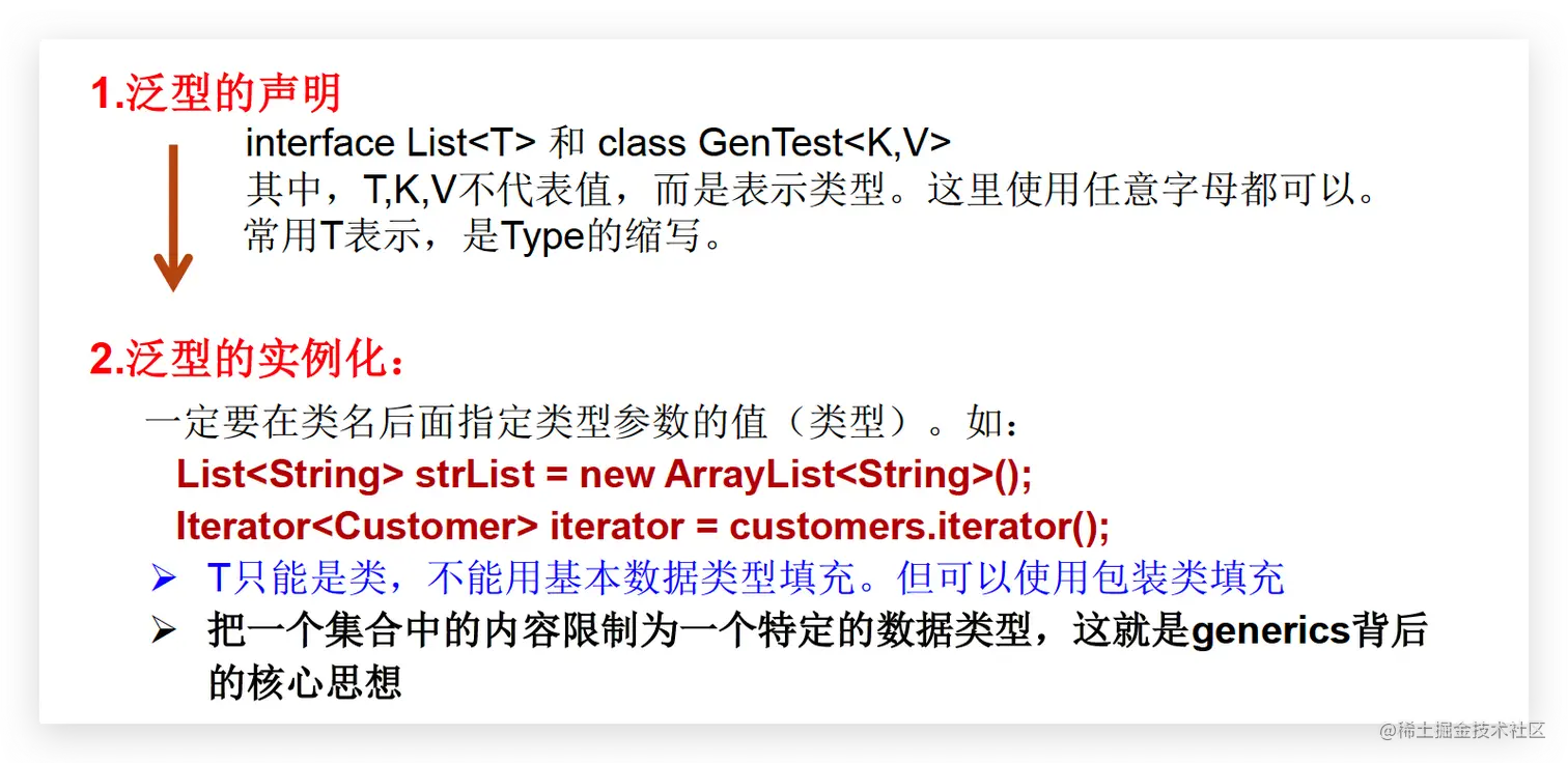 - 泛型如果不指定,将被擦除,泛型对应的类型均按照Object处理,但不等价于Object。经验:泛型一定要一路使用。要不用,一路都不要用。