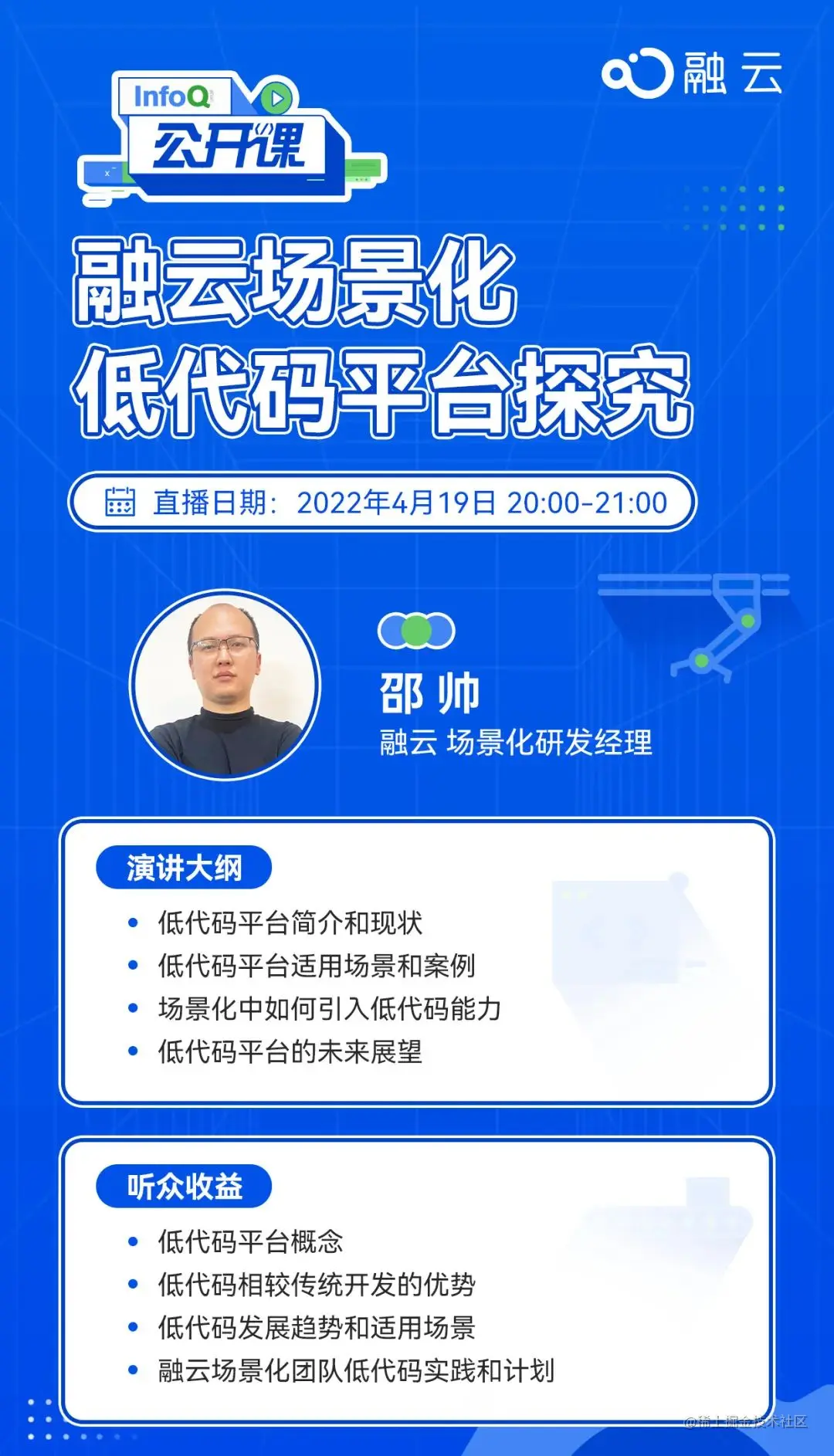 4 月 19 日 20:00-21:00,融云场景化研发经理邵帅将在 InfoQ 公开课中带来《融云场景化低代码平台探究》主题分享~