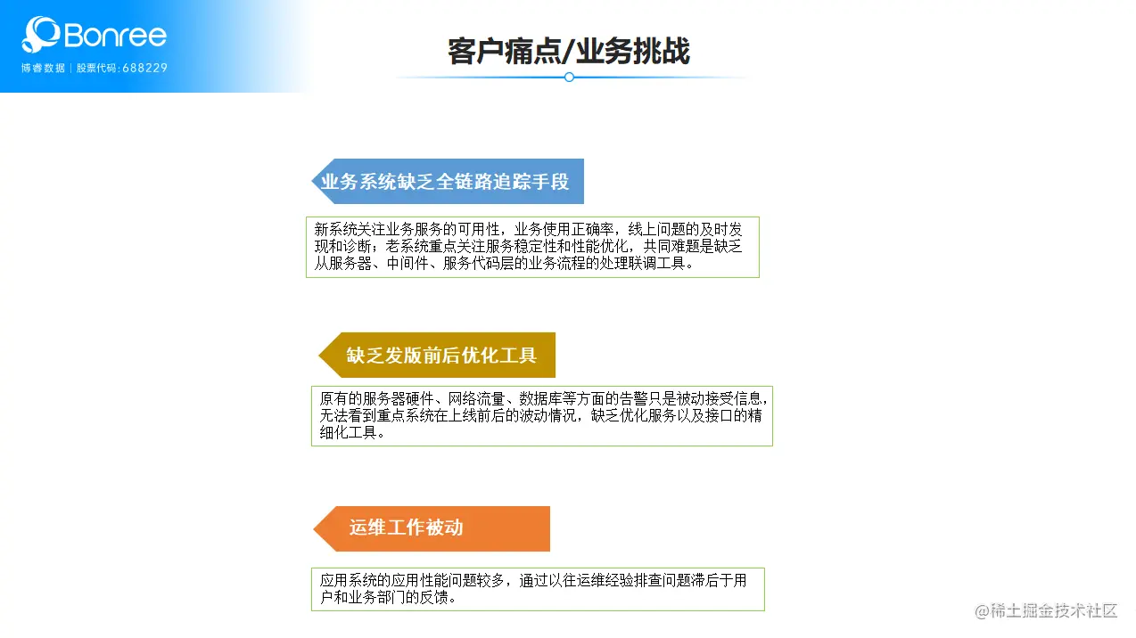 三是应用系统的应用性能问题较多,通过以往运维经验排查问题滞后于用户和业务部门的反馈。