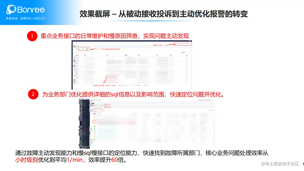 另一方面,从报警优化入手,通过故障主动发现能力和慢sql慢接口的定位能力,快速找到故障所属部门,帮助其核心业务问题处理效率从小时级别优化到分钟级,大大提高了工作效率。
