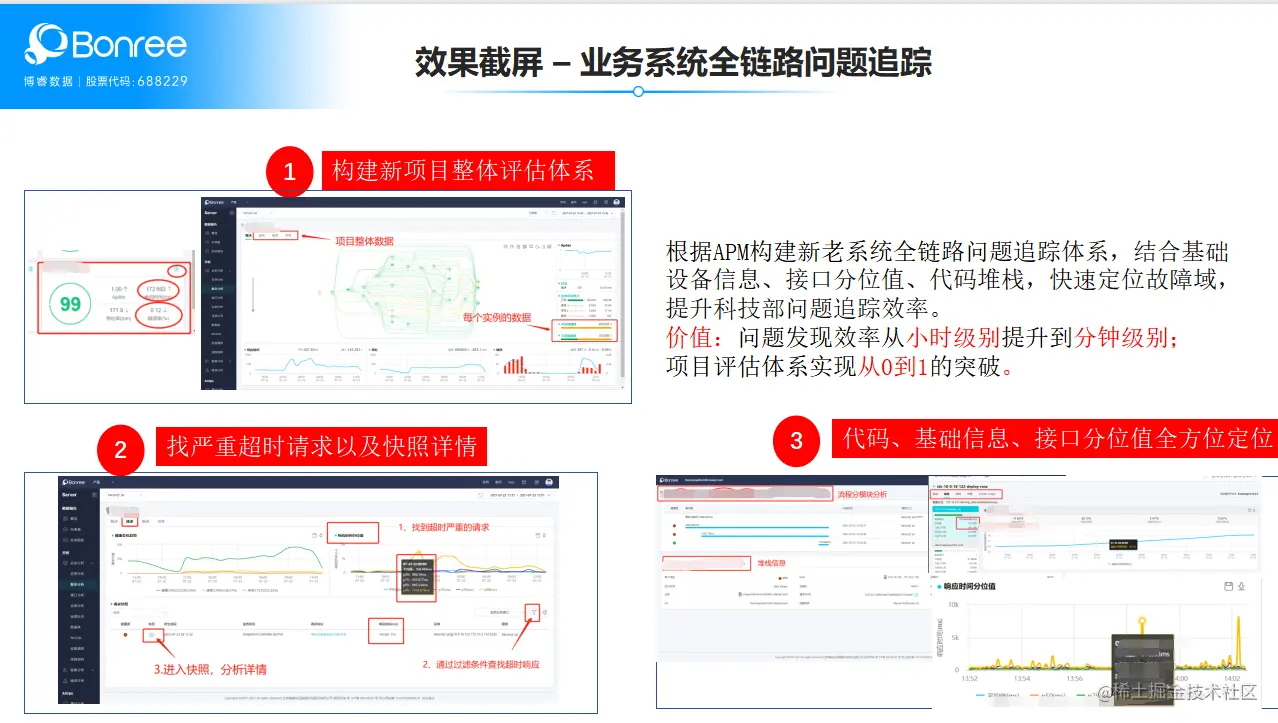 一方面,根据APM构建新老系统全链路问题追踪体系,结合基础设备信息、接口分位值、代码堆栈,快速定位故障域。问题发现效率从小时级别提升到分钟级别;项目评估体系实现从0到1的突破。