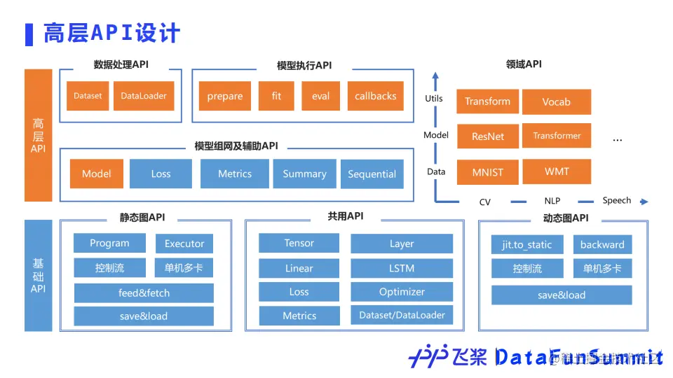 飞桨为了简化用户的开发成本,还设计了高层API。高层API同时支持动态图和静态图,所以使用高层API时不用考虑所使用的编程范式。高层API对数据预处理、数据加载、模型组网、模型训练、模型评估、模型保存等都进行了封装,每个步骤仅使用几行代码即可实现。同时高层API对计算机视觉、自然语言处理等领域API也做了封装,例如transformer中的encoder结构,这样的设计不仅简化了代码,还保证了模型效果和高性能。