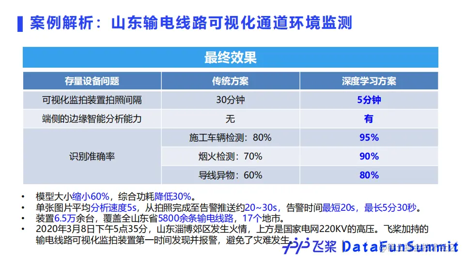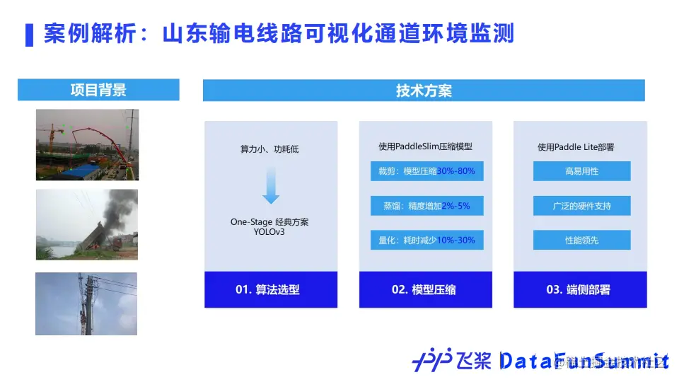 飞桨拥有丰富的产业实践案例,以山东国家电网输电线路可视化通道环境监测为例。