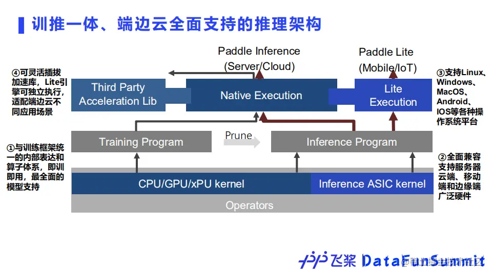 对于推理架构方面,飞桨设计了端边云全面支持的推理引擎架构,由于采用了和训练框架一体的内部表达和算子库,可以完美地实现即训即用,以及最全面的模型支持。除了最广泛的硬件和操作系统平台支持之外,我们也设计并开发了可灵活插拔的加速库,以契合不同场景下部署任务的特点。