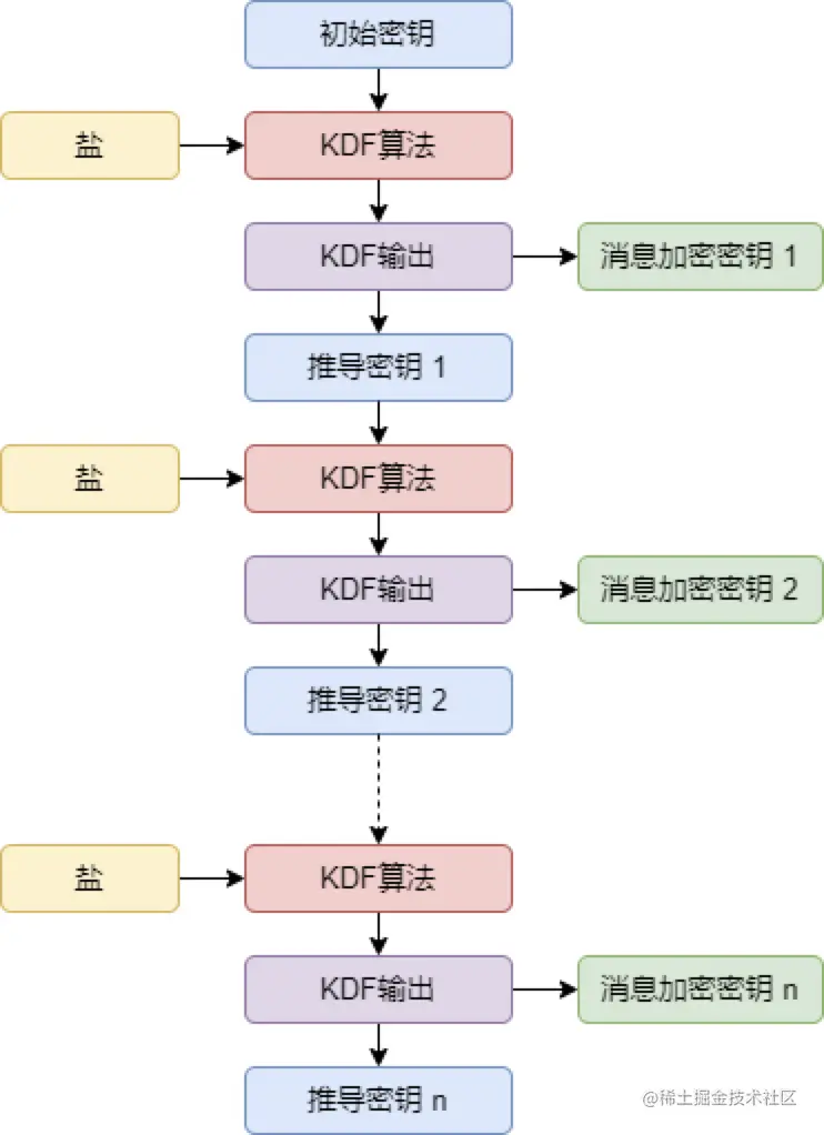 第一步,将初始密钥使用 KDF 算法导出新的密钥,新密钥被切成两部分,前半部分作为下一次 KDF 计算的输入,后半部分作为消息密钥。