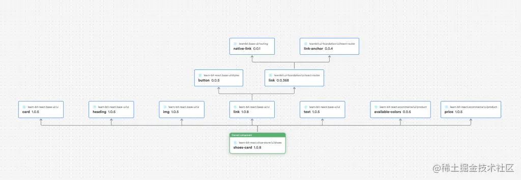 产品卡组件的依赖关系图,每一个单独的包都可以发布到npm,并在许多应用程序中重复使用。